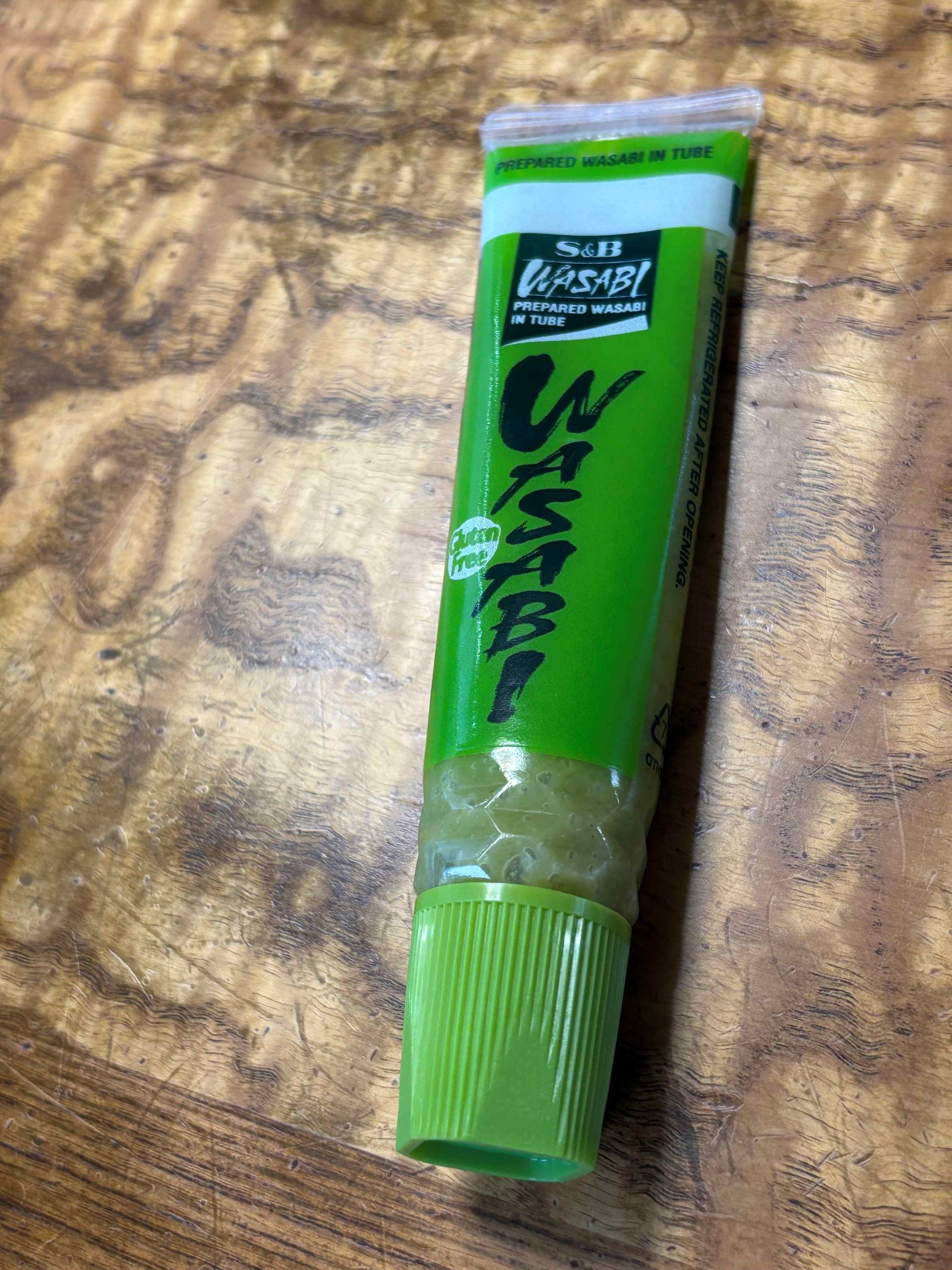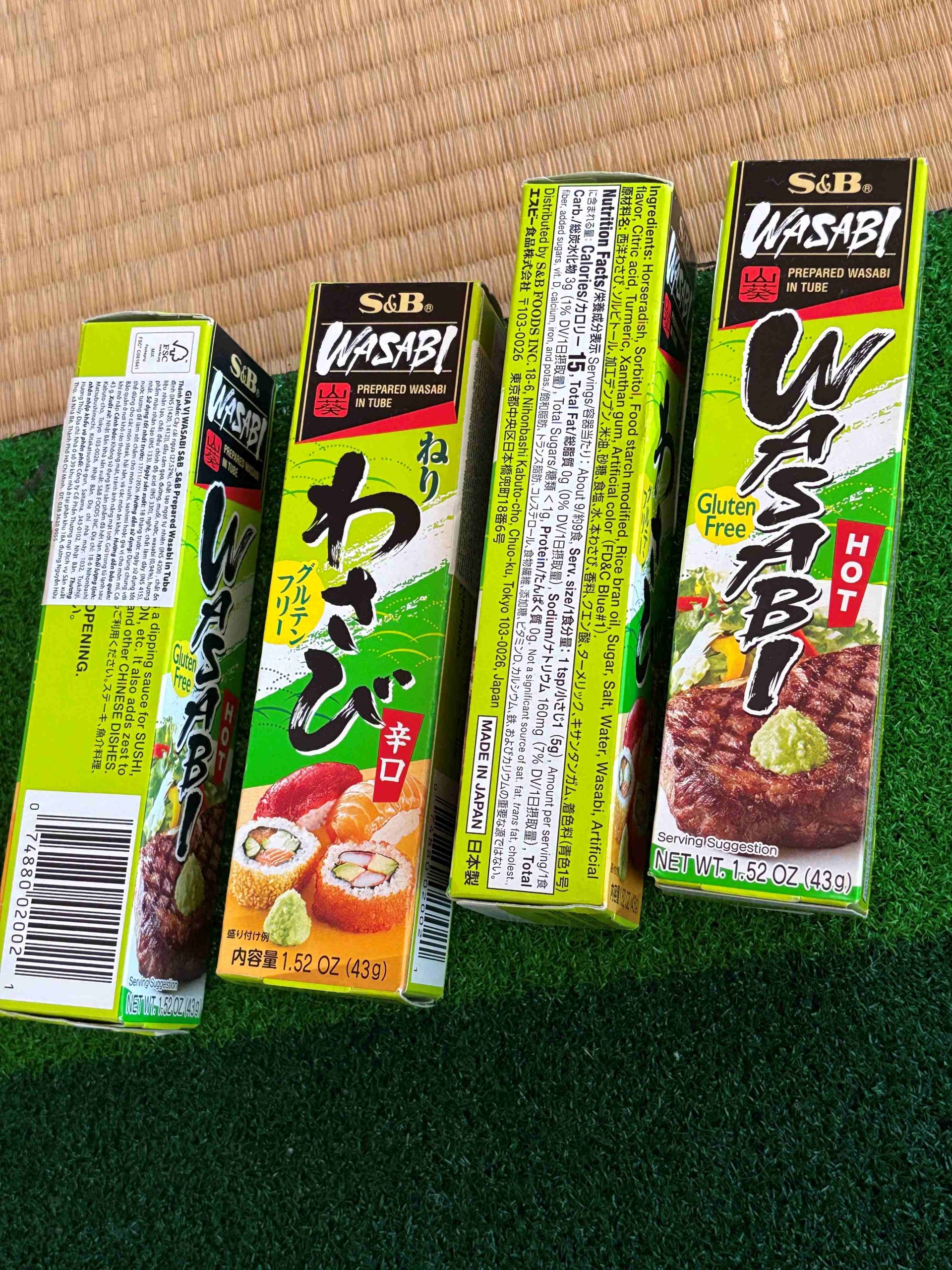 まぁまぁの和食店は、わさびはすりおろしたものが出てきますが、なんちゃって和食店は、写真のS&BのWASABIが定番です。