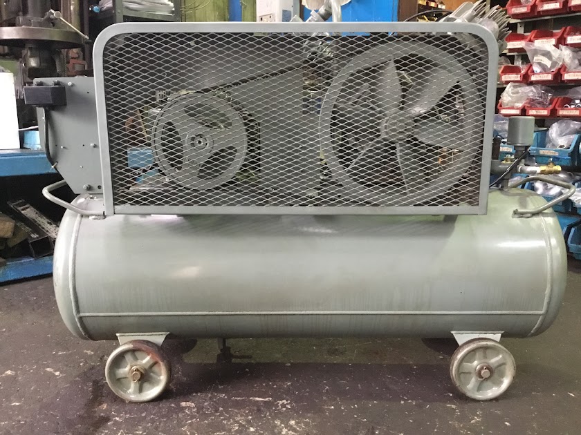 日立産機製 オイル潤滑式レシプロ 3.7kw (5馬力)200V 60hz 能力500L/min 正常  ベルト交換 モーターベアリング交換、オイル交換 弁セット、リングセット交換 その他、分解清掃 試運転良好